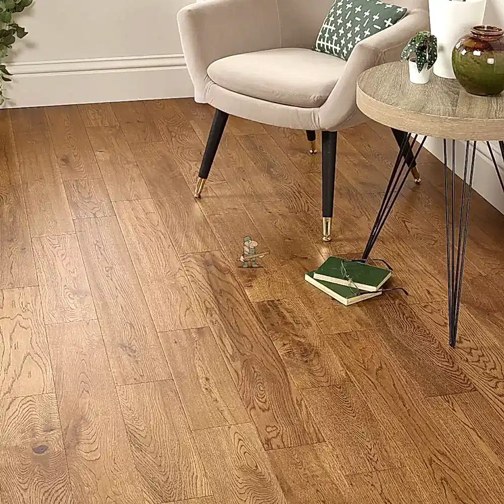 Alabama 125mm Golden Oak Hand Scraped Solid Wood Flooring showcases a beautiful golden oak finish with a hand-scraped texture, bringing a touch of rustic elegance to any room. This solid oak flooring, with a 125mm width and lengths ranging from 300mm to 1200mm, features a hand-scraped surface that enhances the natural grain and adds a unique, tactile quality to the floor.