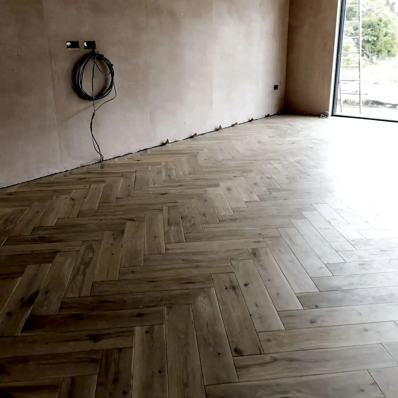 Herringbone flooring adds a unique and sophisticated touch to both residential and commercial spaces. The engineered construction ensures stability and compatibility with underfloor heating systems, making it a versatile choice for modern homes.