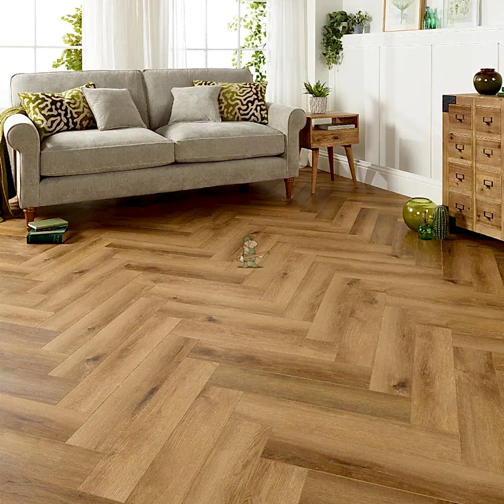 Hydro Pro Herringbone 5mm Warm Oak Luxury Vinyl Click Flooring features 5mm thick, 126mm wide, and 610mm long planks, providing a robust and elegant flooring solution. The Warm Oak design offers a timeless and inviting look, perfect for adding a touch of natural warmth to any room. The luxury vinyl click flooring system ensures easy installation, making it an ideal choice for both DIY enthusiasts and professional installers. The waterproof construction makes it suitable for any area of the home, including kitchens and bathrooms, providing durability and resistance to everyday wear and tear.
