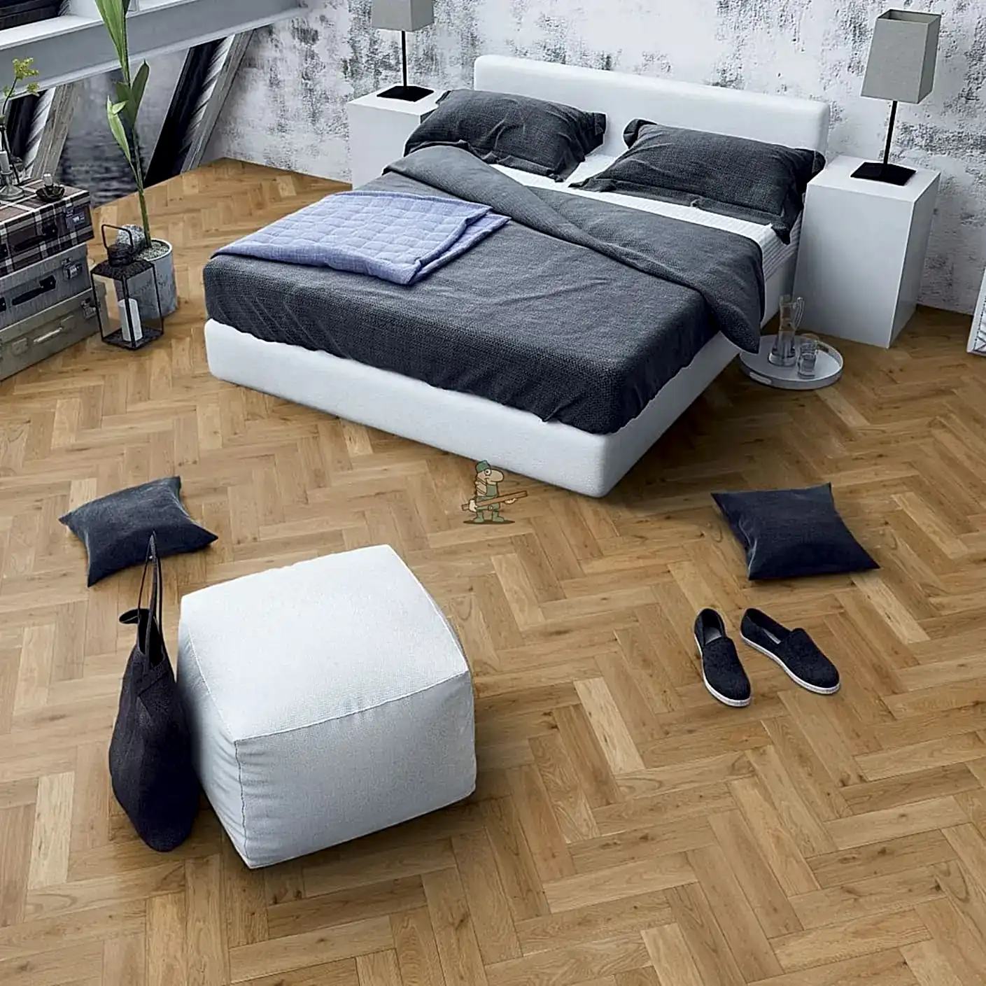 Natural Oak Heritage Herringbone Engineered Wood Flooring is 15mm thick, with a 4mm solid oak veneer, making it one of our most hardwearing floors, that can be sanded down and re-finished for years to come. Lacquered finish offers protection and aesthetic enhancement, making it popular for those seeking durability, easy maintenance, and a glossy appearance in their spaces.