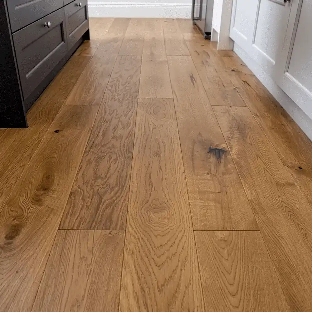 Nature 15/4 x 190mm Golden Oak Handscraped Engineered Wood Flooring is 15mm thick with a 4mm solid oak veneer, offering robust durability.