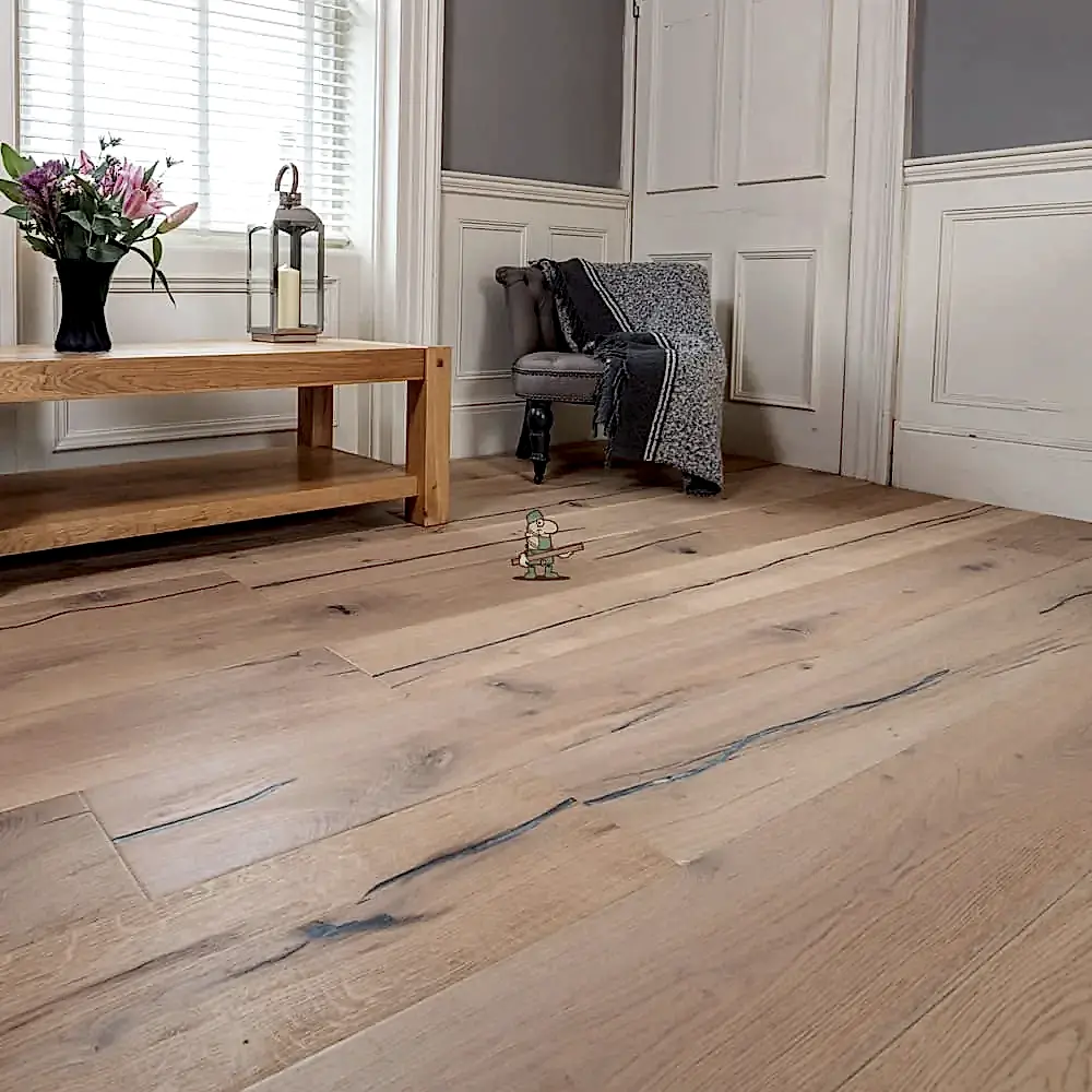 Nature 15/4 x 220mm Vanilla Oak Distressed Premium Engineered Wood Flooring is 15mm thick, with a 4mm solid oak veneer, making it one of our most premium and durable options. The Vanilla Oak Distressed Premium Engineered Wood Flooring, with its Hardwax Oil finish, enhances the distressed look providing a unique combination of texture and protection.