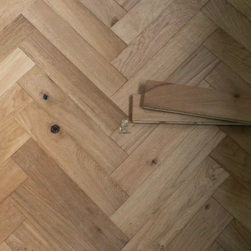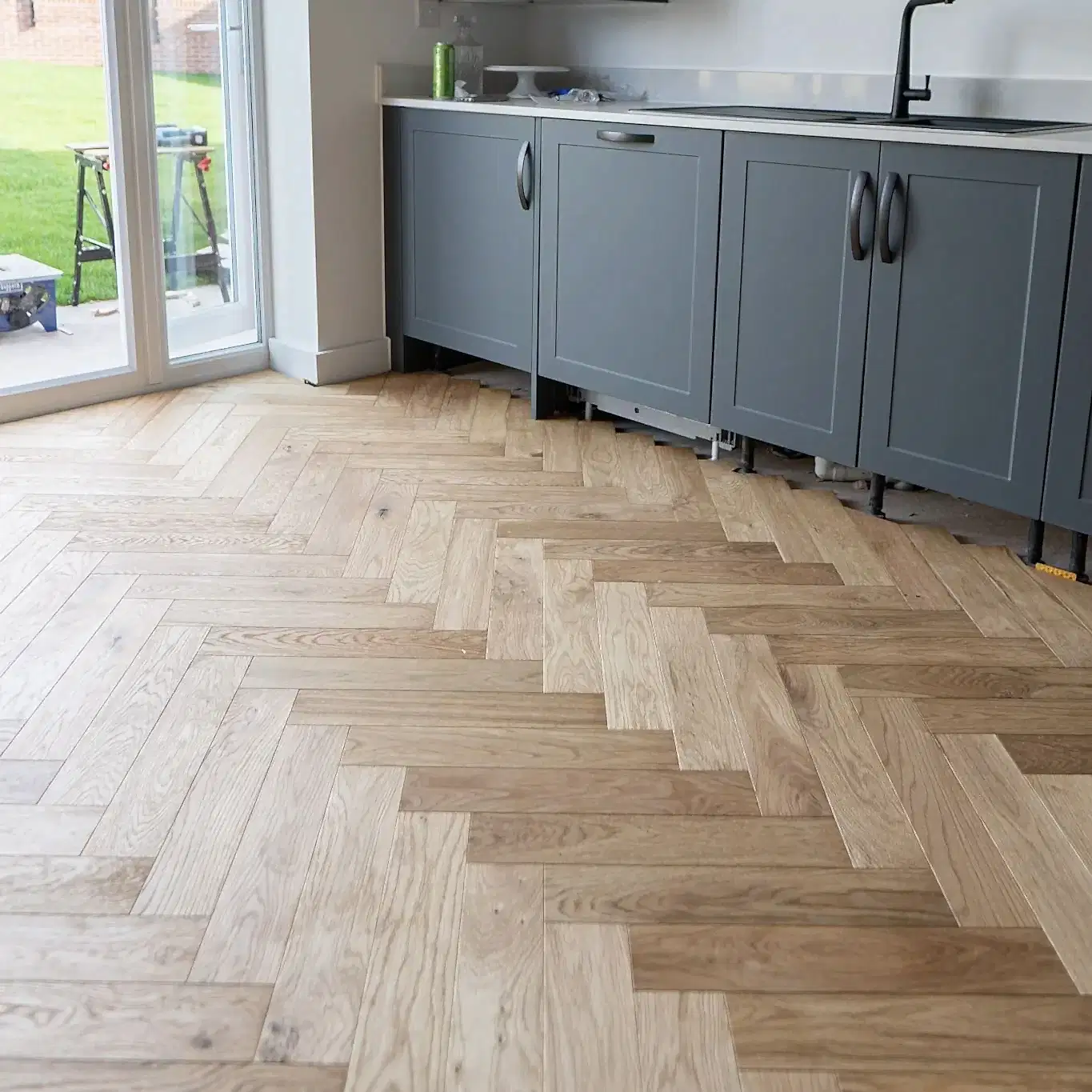 Nature 18/5 x 100mm LARGE Natural Brushed Oak Herringbone Engineered Wood Flooring is 18mm thick, with a whooping 5mm solid oak veneer, making it one of our most hardwearing floors, that can be sanded down and re-finished for years to come. The Large Natural Brushed Oak features a deep neutral rustic design, meticulously manufactured parquet blocks with micro-bevelled edges. The brushed and oiled finish offers a unique combination of texture (deep brushed) and protection. It provides a visually appealing and tactile surface while preserving the natural beauty and durability of wood.