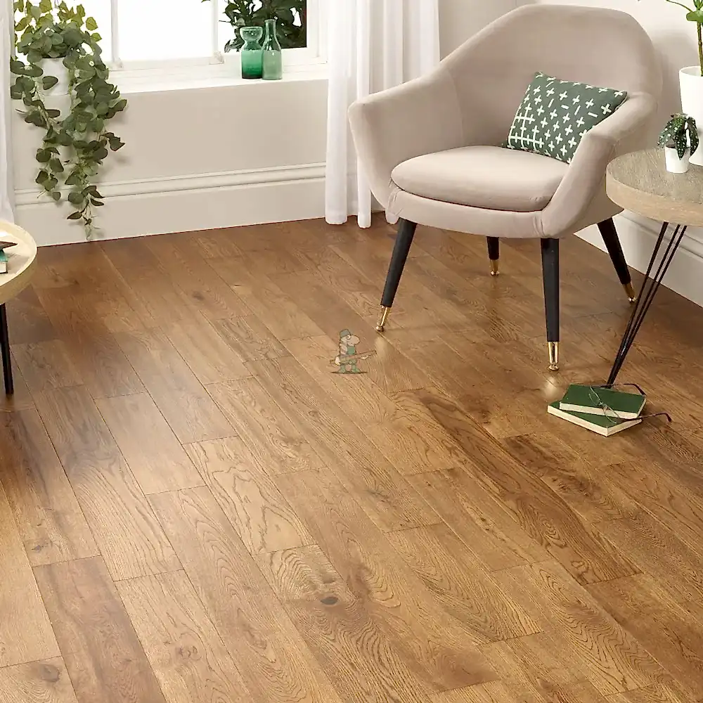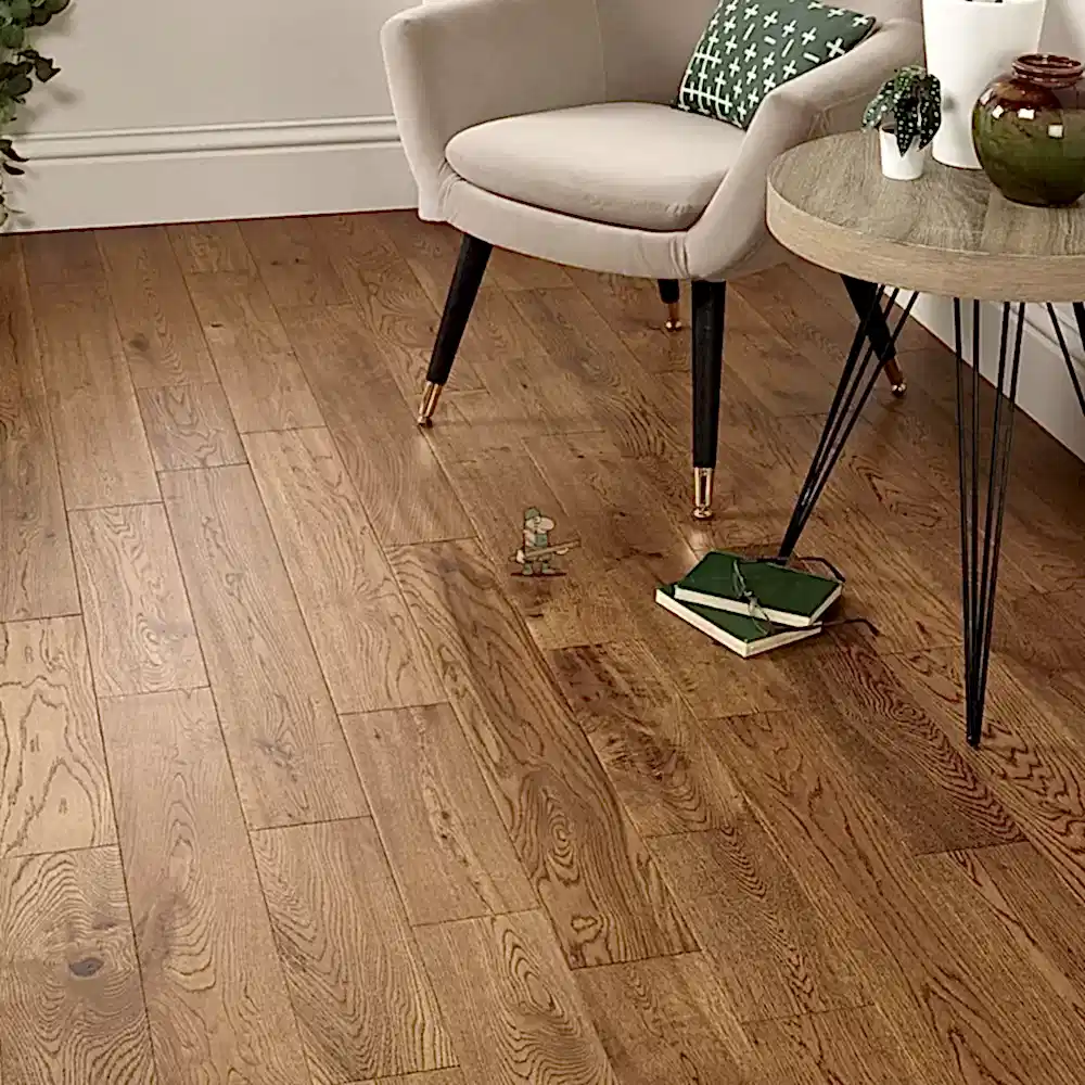 Nature 18/5 x 150mm Golden Oak Handscraped Engineered Wood Flooring is 18mm thick with a 5mm solid oak veneer, offering exceptional durability and a luxurious feel.