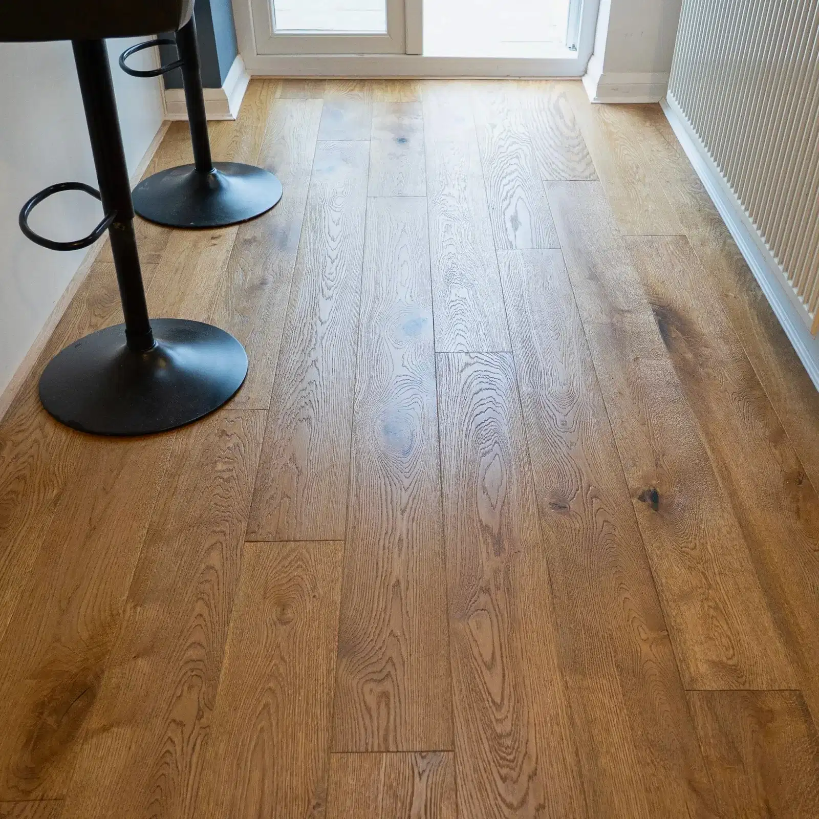 Nature 20/6 x 180mm Brushed Golden Oak Handscraped Engineered Wood Flooring is 20mm thick and comes with a 6mm solid wood veneer, meaning that this floor is hardwearing and can also be sanded down and re-finished several times during its lifetime. The brushed and lacquered finish offers a balance between texture and protection. The brushed effect adds visual interest, while the lacquer ensures longevity and easy maintenance.