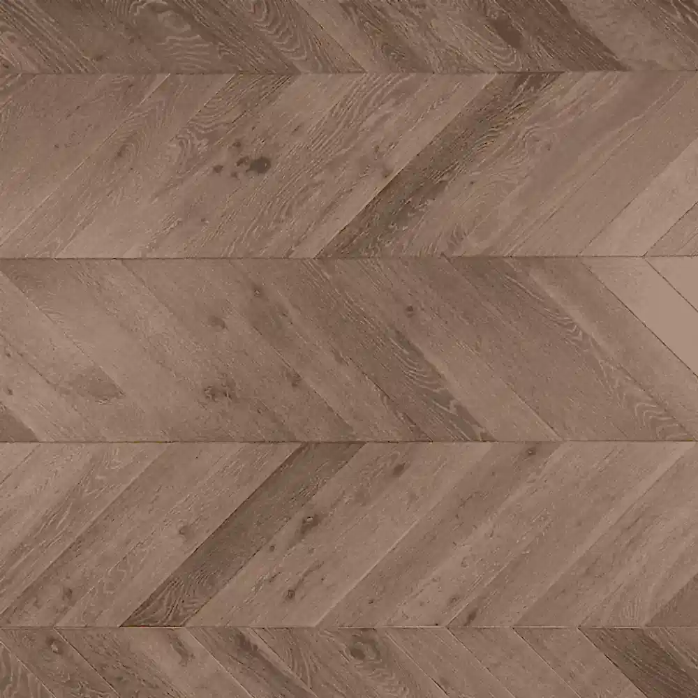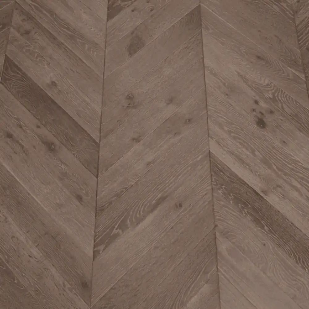This Nevada 14/3 x 90mm Brown Waxed Haze Oak Chevron Engineered Wood Flooring is 14mm thick, with a 3mm solid oak veneer, ensuring a strong and resilient flooring option. The Brown Waxed Haze Oak in a Smoked Grey finish exudes a contemporary and stylish appeal, perfect for modern interiors. The chevron pattern adds a sophisticated and dynamic visual interest, enhancing the elegance of any room. The smoked and waxed finish provides a rich texture and depth, highlighting the natural beauty of the oak while offering superb protection against everyday wear and tear.