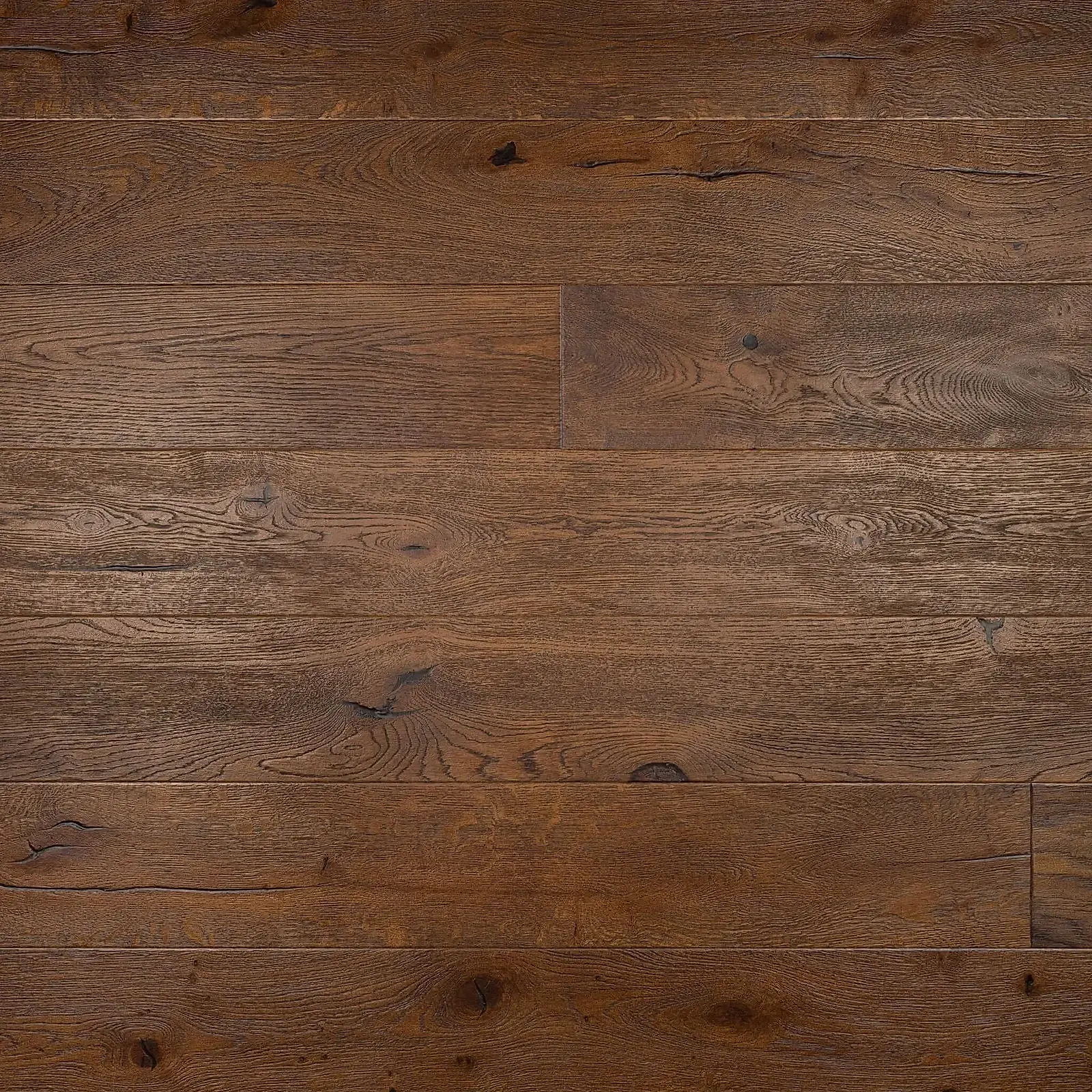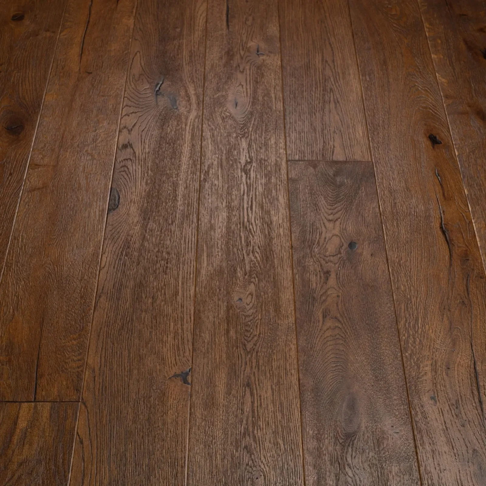 This New York 14/3 x 190mm Antique Brown Oak Distressed Premium Engineered Wood Flooring is 14mm thick, with a 3mm solid oak veneer, offering a robust and long-lasting flooring solution. The Antique Brown Oak Distressed Premium features a distressed finish that brings a rich, vintage character to any room, creating a warm and inviting atmosphere. The finish accentuates the natural grain and knots of the oak, providing a beautifully aged and sophisticated look.