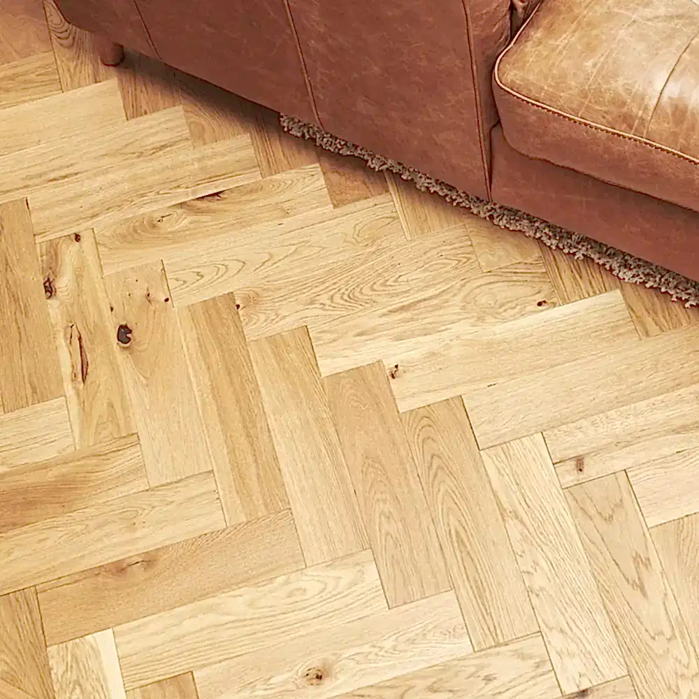 This Parquet 18 x 90mm Natural Oak Herringbone Solid Wood Flooring features 18mm thick planks with a 90mm width and 300mm length, crafted from natural oak to provide a durable and long-lasting flooring solution. The Natural Oak Herringbone Solid Wood Flooring showcases the inherent beauty and grain of the wood, adding a warm and timeless elegance to any space. The brushed matt lacquered finish offers a subtle, matte sheen that enhances the oak’s texture while providing a layer of protection against wear and tear.