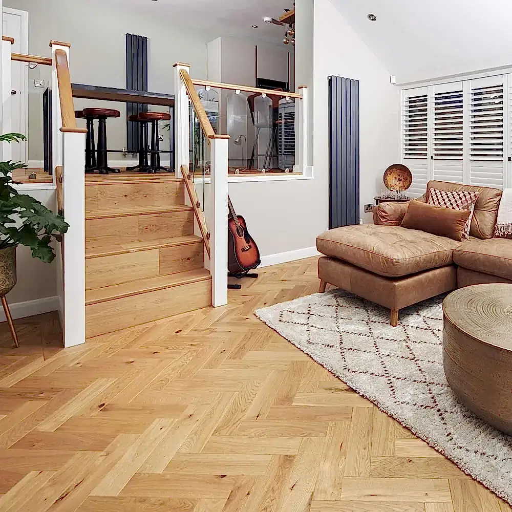 Herringbone is an ideal choice for introducing a unique and sophisticated pattern to any room. Suitable for both residential and commercial settings, this flooring is known for its strength and longevity. Fully compatible with underfloor heating systems, it ensures warmth and comfort throughout your home or office. The solid wood construction allows for multiple sanding and refinishing over its lifetime, maintaining its stunning appearance and functionality for years to come.
