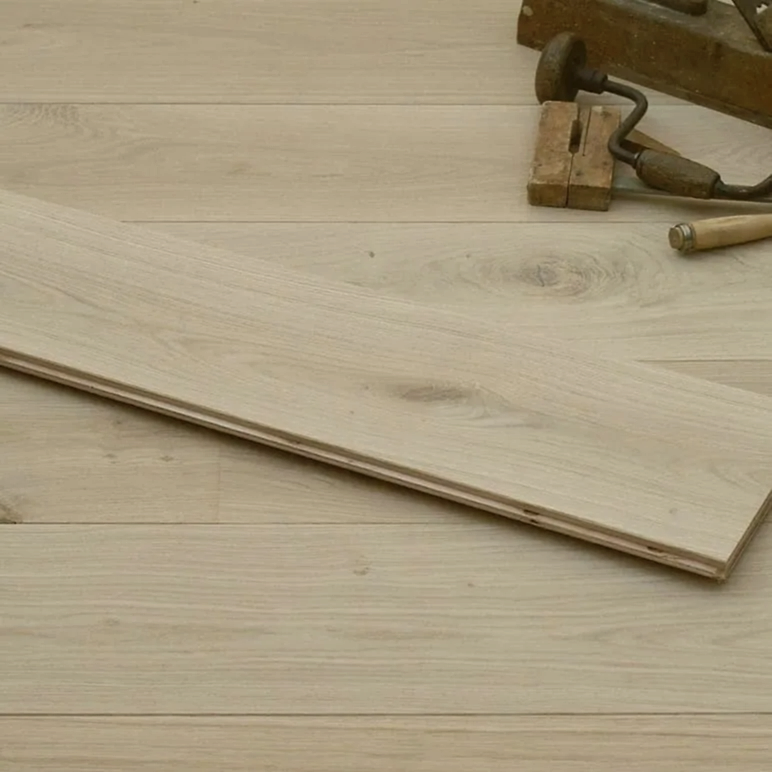 The Unfinished XL Oak Engineered Wood Flooring provides a raw and authentic feel, ideal for those who prefer a natural, rustic look or wish to apply their own custom finish. This flooring is perfect for both residential and commercial settings, fully compatible with underfloor heating systems. Its engineered construction ensures stability and resilience, capable of being sanded and refinished multiple times throughout its lifespan, making it a versatile and enduring choice for any space.