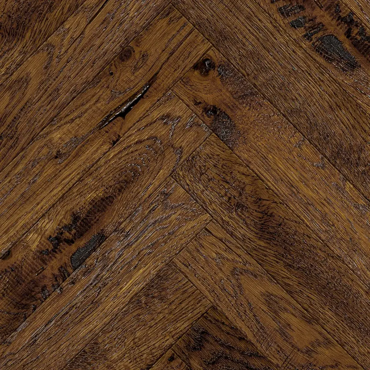 This Riviera 14/3 x 125mm Antique Oak Herringbone Herringbone Engineered Wood Flooring thick, with a 3mm solid oak veneer offering a perfect blend of durability and elegance. Antique Oak flooring showcases the timeless charm of aged wood with warm, rustic tones and a beautifully distressed finish. Its rich character and natural grain make it a perfect choice for adding a touch of classic elegance to any space, from vintage-inspired to modern rustic interiors.