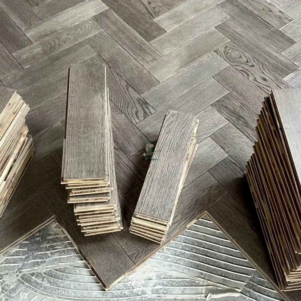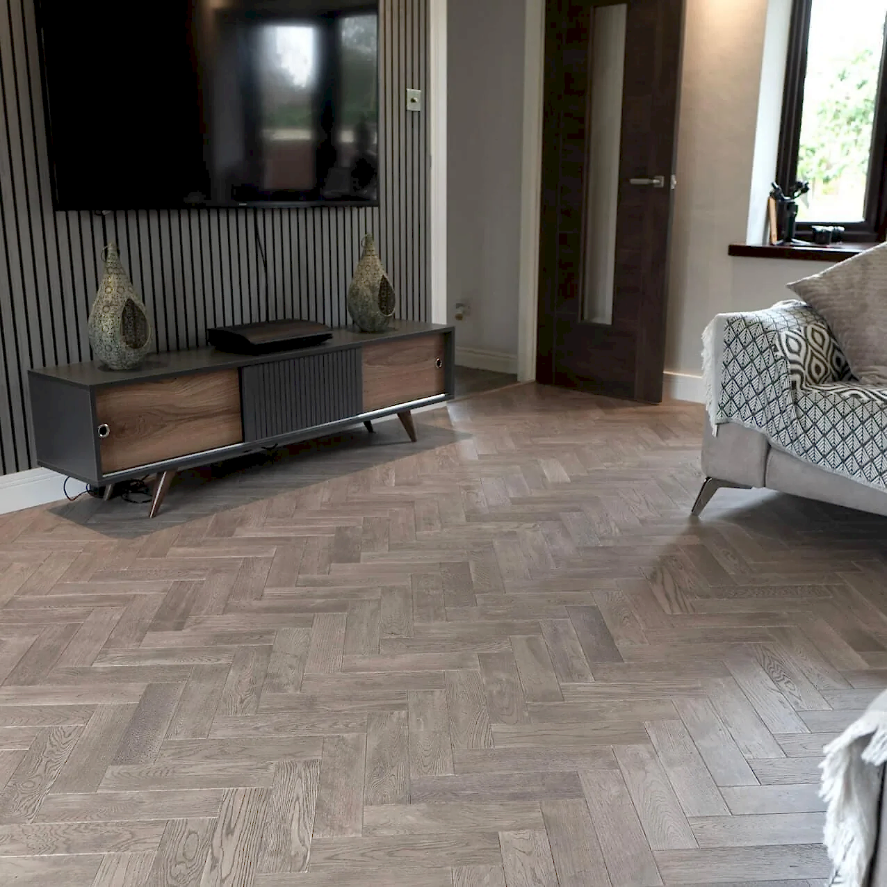 This Riviera 18/3 x 80mm SMALL Sterling Silver Oak Herringbone Engineered Wood Flooring is 18mm thick, with a 3mm solid oak veneer (W 80 x L 300mm), resembling the look of old-school small parquet blocks. This Sterling Silver Oak offers a sophisticated and contemporary aesthetic, perfect for enhancing any room’s decor. The brushed and matt lacquer finish provides a textured, natural look while delivering superior protection against daily wear and tear.