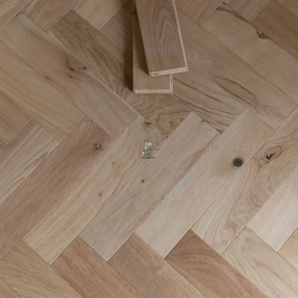This Riviera 18/4 x 90mm Pale Invisible Oak Herringbone Engineered Wood Flooring is 18mm thick, with a 4mm solid oak veneer, making it one of our most durable and long-lasting engineered floors. The Pale Invisible Oak features a subtle and contemporary look, perfect for brightening any space while maintaining a sophisticated elegance. The invisible oiled finish enhances the natural beauty of the oak, providing a matte, untreated appearance while offering exceptional protection against everyday wear and tear.