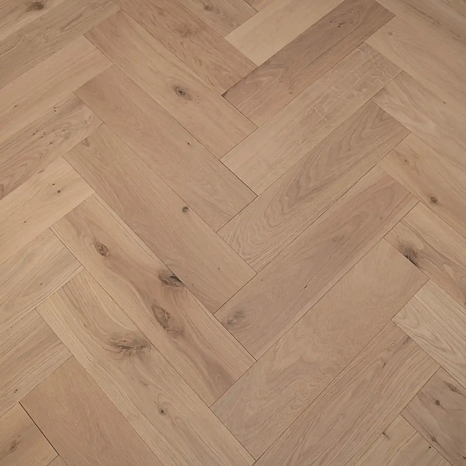 This Riviera Click 14/3 x 150mm Pale Invisible Oak Herringbone Engineered Wood Flooring is 14mm thick, with a 3mm solid oak veneer, providing a robust and durable flooring solution. The Pale Invisible Oak offers a subtle and contemporary look, enhancing any room with its understated elegance. The natural brushed lacquered finish adds a tactile texture to the surface, highlighting the wood’s grain while offering superior protection against everyday wear and tear. The ease of installation with click system engineered wood flooring comes from its design that allows planks to lock together easily.