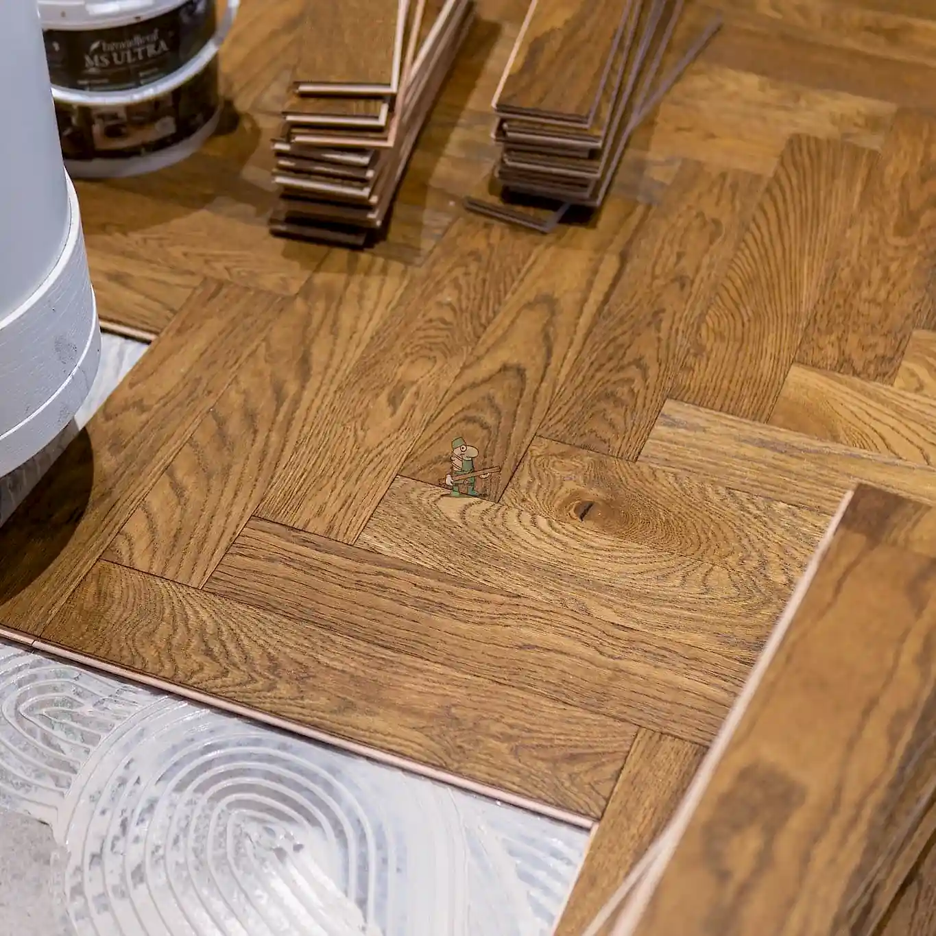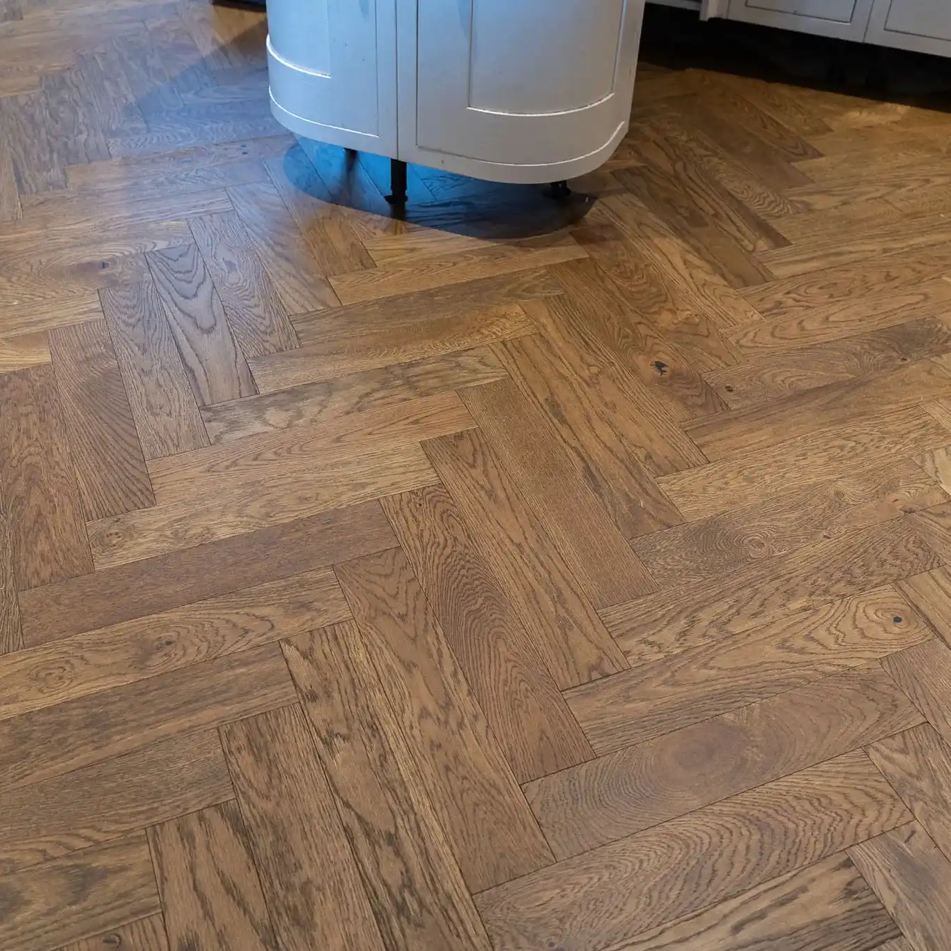 Trade 12mm Golden Smoked Oak Herringbone Engineered Wood Flooring offers a luxurious yet budget-friendly option for elegant interiors. Featuring a 1.2mm real oak veneer, this engineered wood flooring showcases rich golden smoked oak tones with a brushed & lacquered finish, enhancing the natural wood grain while providing extra durability. With a 12mm thickness for added stability, this flooring is both stylish and practical!